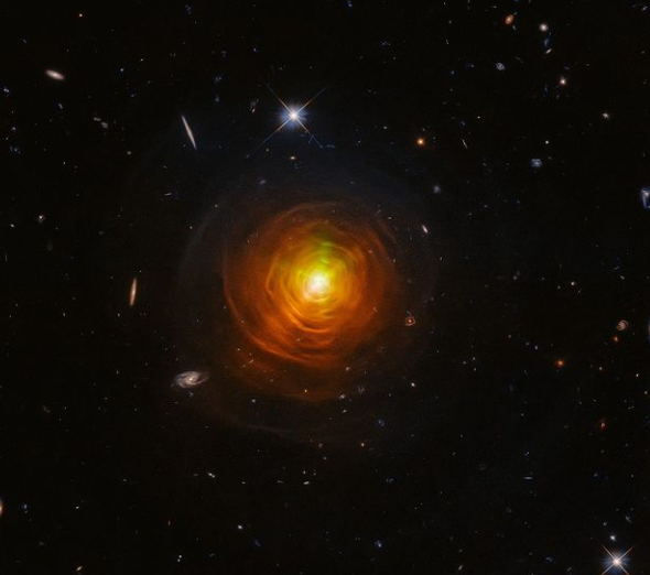Este es el aspecto de la estrella gigante roja CW Leonis con su envoltura de carbono anaranjado captada por el Telescopio Espacial Hubble y publicada por la Agencia Espacial Europea.