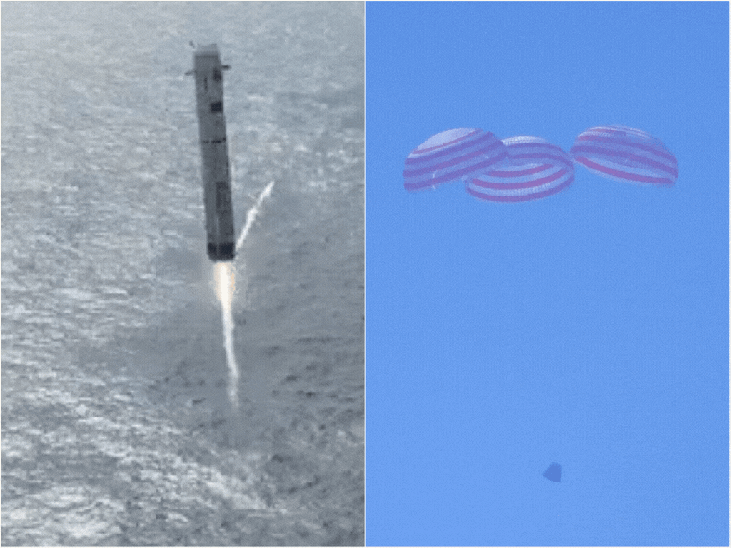 Durante el descenso, la etapa desplegó cuatro rejillas aerodinámicas o “grid fins”, superficies de control que permiten modificar la trayectoria mediante el flujo de aire en la fase atmosférica. Estas estructuras, ya empleadas por otros sistemas reutilizables, facilitan el guiado hacia una zona de amerizaje predeterminada. En la parte final del descenso, varios motores YF-100K se reencendieron para efectuar maniobras de frenado, reduciendo la velocidad antes del contacto con el mar en el mar de China Meridional. La etapa amerizó de forma controlada, aunque se fragmentó parcialmente tras el impacto con el agua.