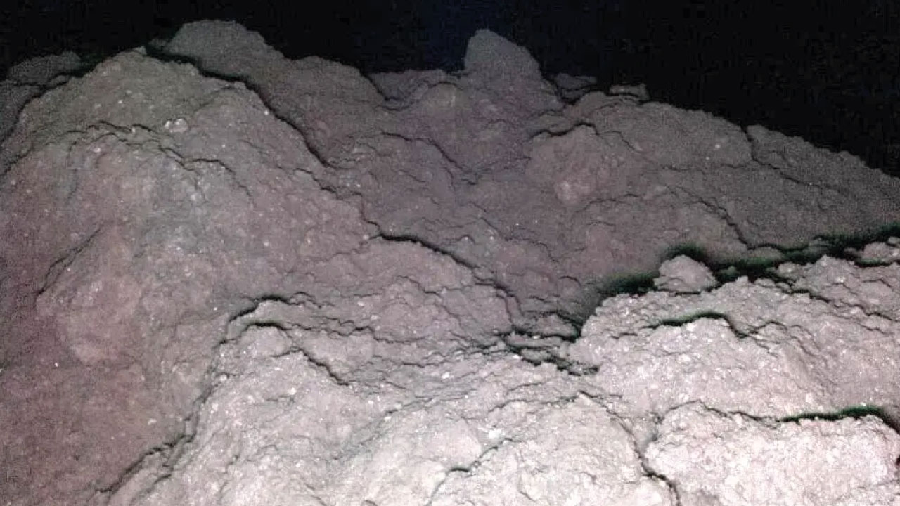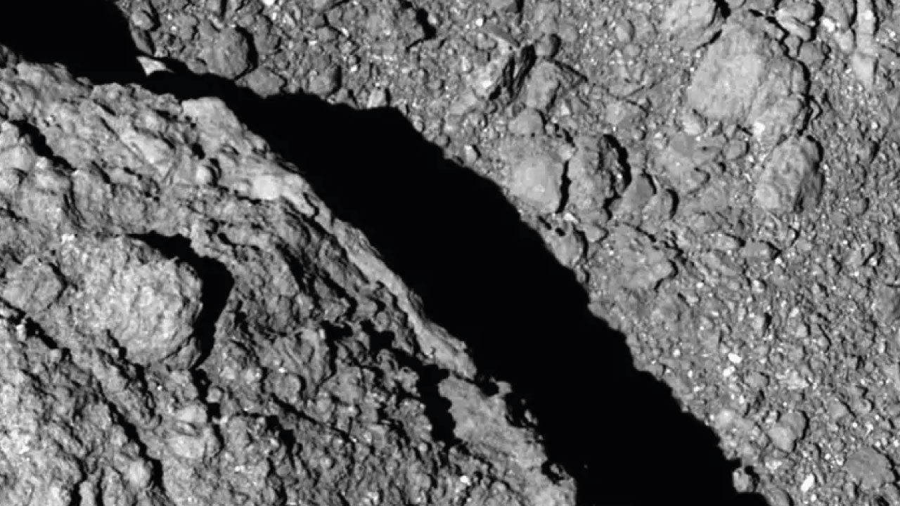 La superficie de Ryugu destaca por su color oscuro y su bajo albedo geométrico, de apenas un 4,5%, lo que significa que refleja muy poca luz solar. A simple vista, sería más oscuro que el carbón. Este dato es consistente con la presencia de materiales ricos en carbono y confirma su afinidad con las condritas carbonáceas, un tipo de meteorito muy valorado en la investigación planetaria.