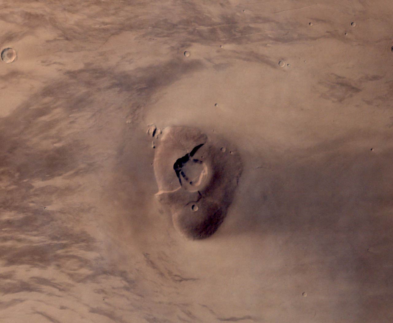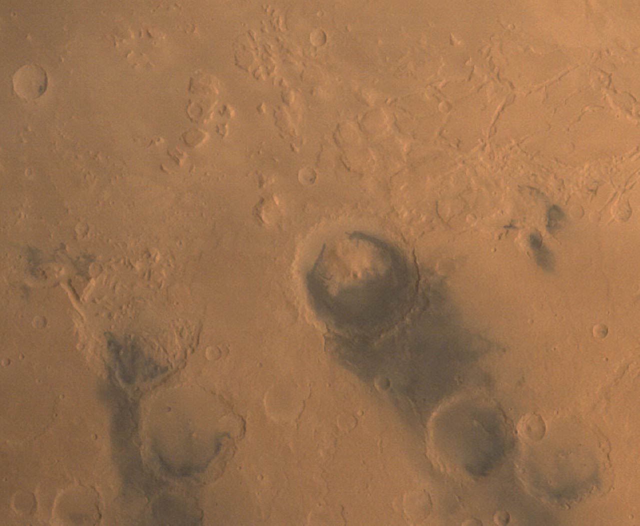 Imagen de contexto regional del Cráter Gale, lugar de aterrizaje del rover Curiosity, captada por la Mars Orbiter Mission el 17 de enero de 2015. Se distingue su “barba” oscura formada por dunas de arena.