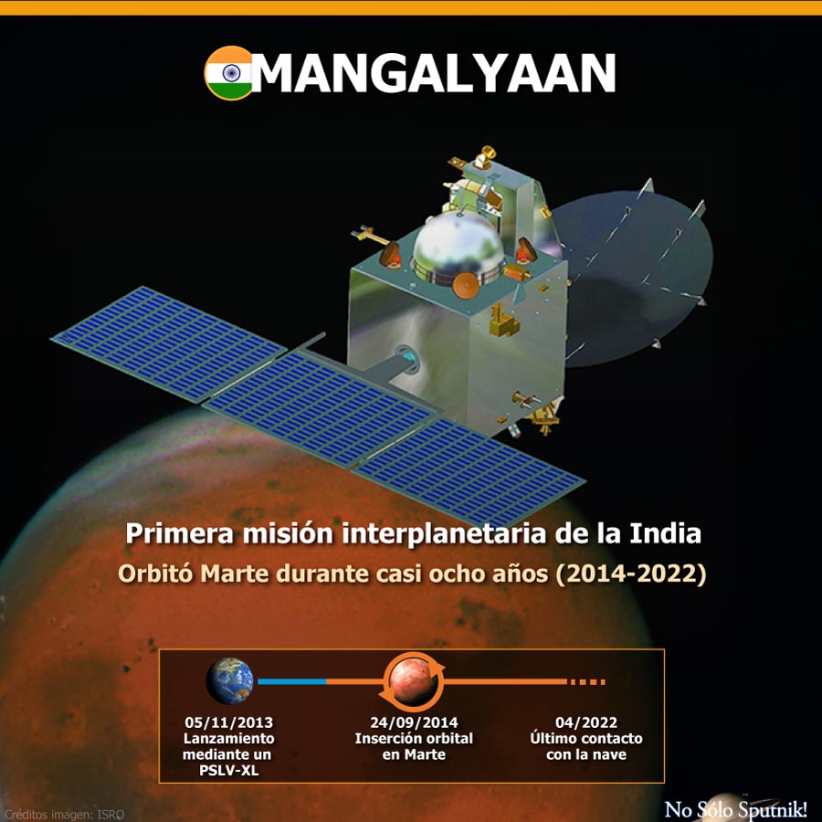 Primera misión interplanetaria de la India. Orbitó Marte durante casi ocho años (2014-2022)