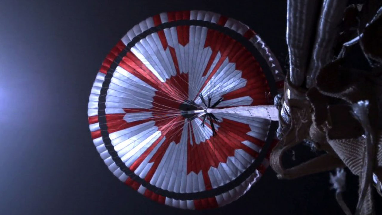 A unos 11 km de altitud y todavía a más de 1.500 km/h, se desplegó un paracaídas supersónico de 21,5 metros de diámetro. Esta apertura se produjo con precisión gracias a un sistema de navegación visual autónoma denominado TRN (Terrain-Relative Navigation), capaz de identificar accidentes geográficos en tiempo real y elegir la zona más segura dentro de la elipse de aterrizaje. Una cámara situada en el escudo trasero grabó la apertura del paracaídas, que fue seguida en directo desde la Tierra con unos minutos de retraso.