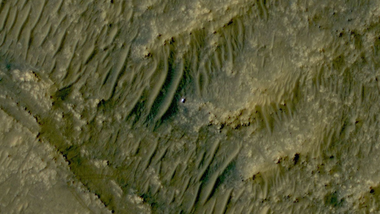 La cámara HiRISE del Mars Reconnaissance Orbiter captó el 18 de febrero de 2021 a la etapa de descenso que transportaba al rover Perseverance atravesando la atmósfera marciana hacia el cráter Jezero.
