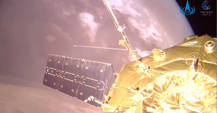 Imagen tomada por una cámara a bordo del módulo de descenso de Tianwen 1 mostrando el paracaídas desplegado durante la fase de entrada atmosférica el 14 de mayo de 2021.