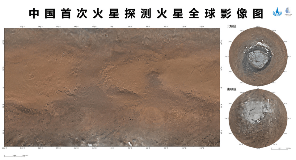 Proyección Mercator de Marte y los casquetes polares a partir de los datos de la misión Tianwen 1.