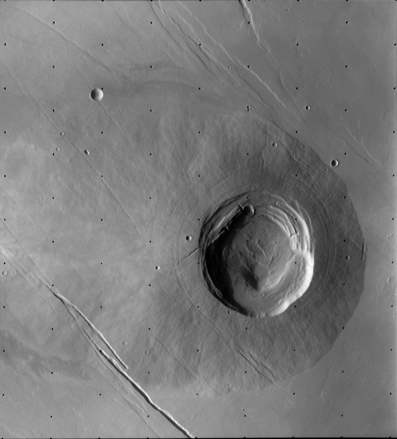 Pequeño volcán marciano Biblis Patera, de unos 100 km de diámetro, captado por el orbitador Viking 2