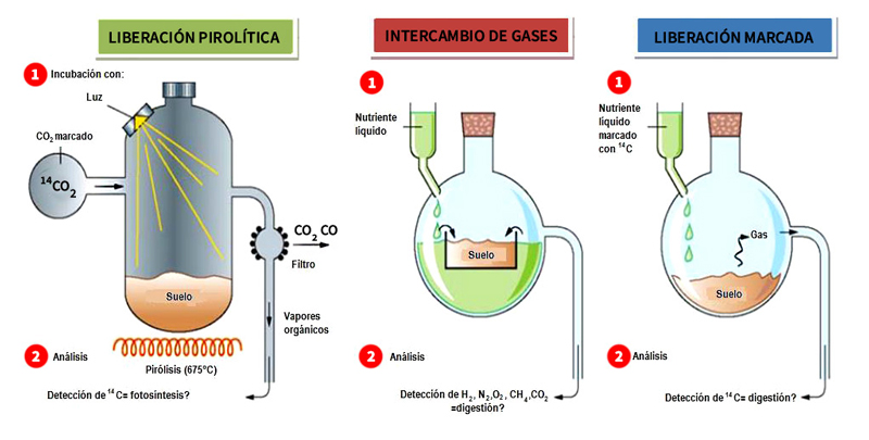 - Experimento de Liberación Marcada (LR): Considerado el más controvertido, este experimento buscaba detectar metabolismo microbiano mediante la oxidación de nutrientes marcados isotópicamente. En ambos sitios de aterrizaje (Viking 1 y 2), los resultados fueron positivos, lo que generó un intenso debate. Aunque muchos científicos concluyeron que la actividad observada era de origen químico, Gilbert Levin, líder del experimento, sostiene hasta hoy que las señales observadas son indicativas de actividad biológica.