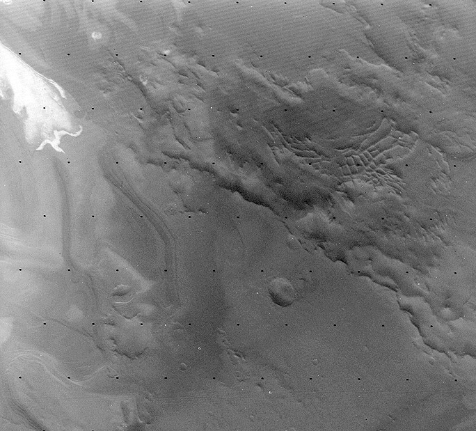 Estructura cuadrangular denominada «Inca City» captado por el orbitador Viking 2. Las celdas cuadradas individuales tienen entre 4 y 5 km de ancho. Se puede ver un depósito de hielo en la parte superior izquierda de la imagen, que está al sur.