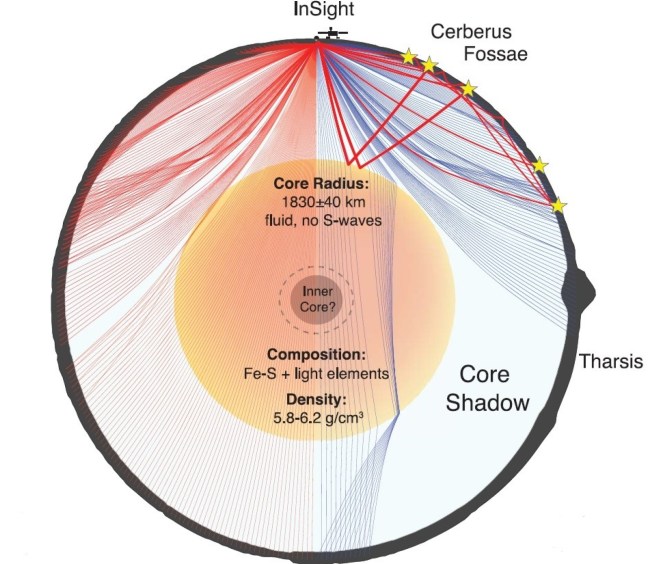 La mayor actualización sobre la estructura interna de Marte se refiere a su núcleo. Durante años se consideró que era totalmente líquido o, como mucho, con indicios de cristalización incipiente. Sin embargo, los datos sísmicos de InSight han permitido identificar ondas reflejadas y transmitidas en el interior que confirman la existencia de un núcleo interno sólido. Este núcleo tiene un radio de 613 ± 67 km, rodeado por un núcleo externo líquido cuyo radio alcanza unos 1.800 km. Proporcionalmente, el núcleo interno ocupa alrededor del 18 % del radio marciano, una cifra casi idéntica al 19 % que representa el núcleo interno en la Tierra, lo que revela un sorprendente paralelismo estructural entre ambos planetas.