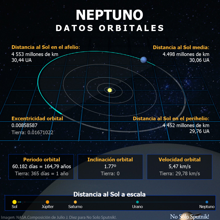 La órbita del gigante Neptuno en torno al Sol tiene un radio medio de 30,06 UA o lo que es lo mismo, 30 veces más lejos que nuestro planeta. Una unidad astronómica UA equivale a 150 millones de kilómetros y es la distancia media entre el Sol y la Tierra. Demora 60.189 días en dar una vuelta completa al Sol. ¡Un año en Neptuno dura más de 164 años terrestres!. El 11 de julio de 2011 realizó la primera traslación completa o año neptuniano desde que fue descubierto.