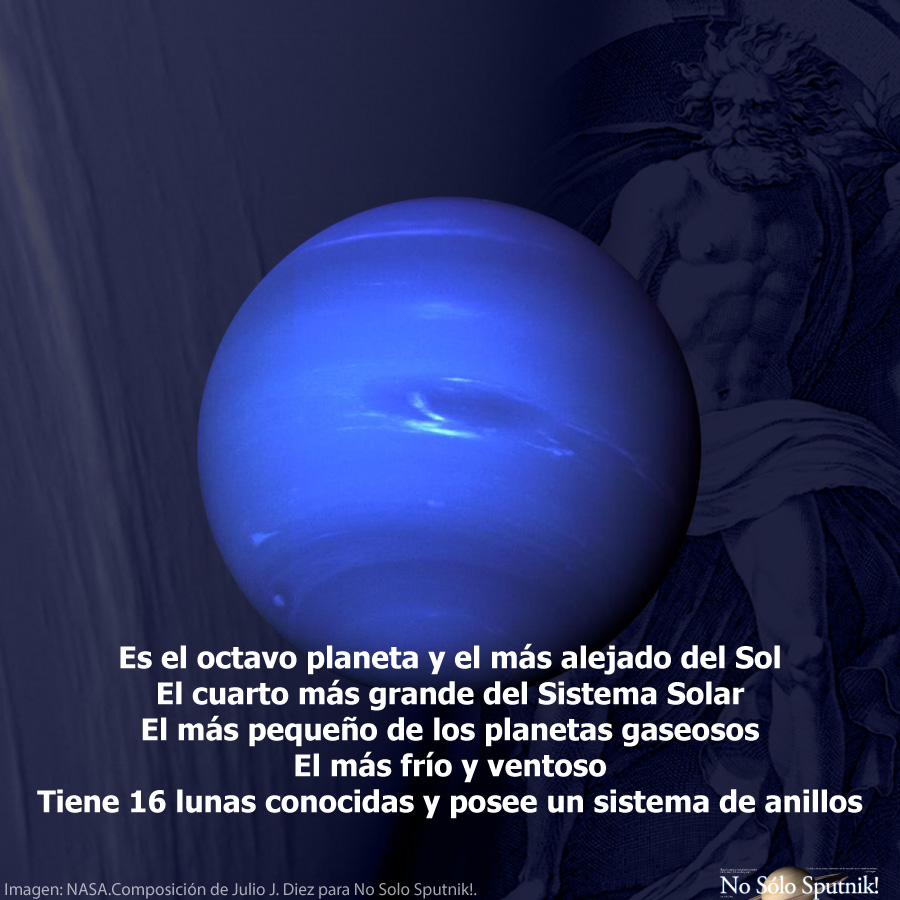Neptuno es el octavo planeta más alejado del Sol y último de los planetas conocidos del sistema solar desde que Plutón pasó a denominarse planeta enano. Es el tercer planeta del sistema solar de mayor masa y el cuarto de diámetro. Es el más pequeño de los denominados planetas gaseosos. Similar en tamaño y composición al planeta Urano, ambos tienen igual composición de hidrógeno y helio que los planetas Júpiter y Saturno, pero a diferencia de ellos poseen una mayor presencia de hielos (agua, amoníaco y metano) por lo que se les considera también gigantes helados.