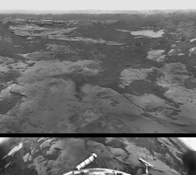 Imagen recibida desde la superficie de Venus enviada por la sonda Venera 10. En la parte inferior se muestra la versión reprocesada de la original por Don P. Mitchell.