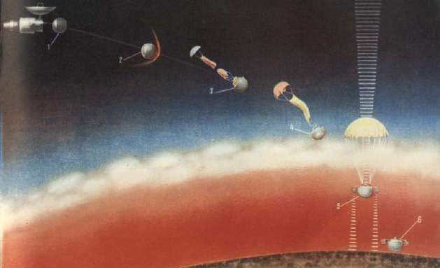 Esquema de la separación de la cápsula de descenso, ingreso en la atmósfera y despliegue de paracaídas de la sonda Venera 4.