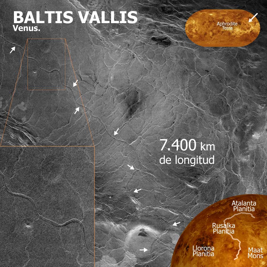 Baltis Vallis es el canal más largo conocido de Venus y, por extensión, de todo el Sistema Solar. Su trazado se extiende a lo largo de unos 7.431 kilómetros, una distancia superior a la del río Nilo, a través de las llanuras del hemisferio norte del planeta. Fue identificado por primera vez en 1983 en los mapas de radar obtenidos por las sondas soviéticas Venera 15 y Venera 16, y cartografiado con detalle en la década de 1990 gracias a la misión Magallanes de la NASA. Su morfología, de anchura casi constante y un recorrido sinuoso pero continuo, lo clasifica como un canal de tipo “canali”, una forma de relieve exclusiva de Venus caracterizada por su longitud excepcional, su lecho único y su semejanza superficial con los cauces fluviales terrestres.