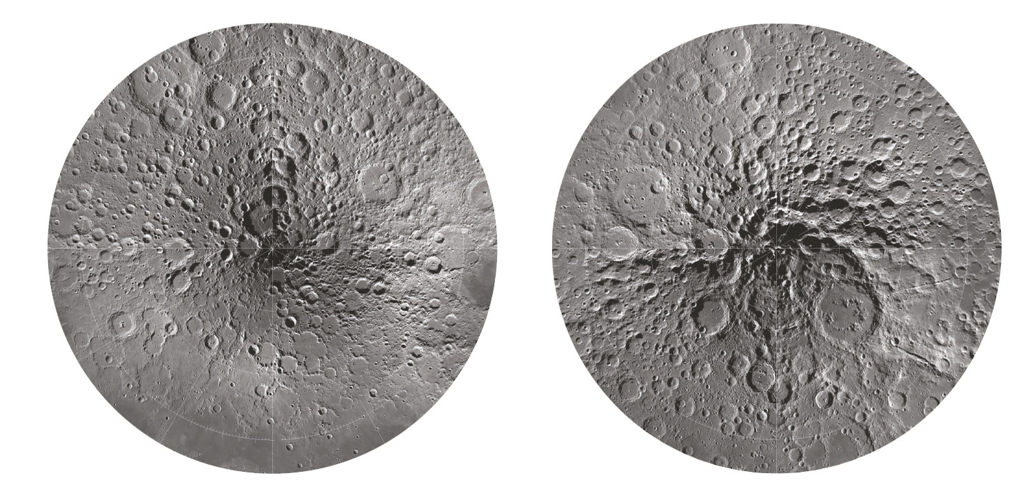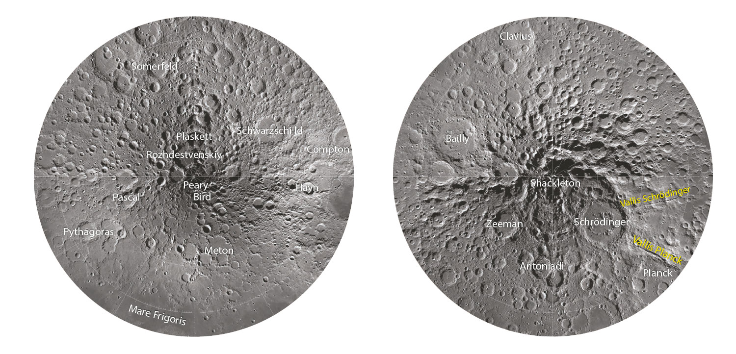 La topografía lunar también refleja diferencias entre regiones ecuatoriales y polares. En los polos, la inclinación casi nula del eje lunar permite la existencia de cráteres con sombra permanente en sus fondos, como Cabeus y Shackleton. Estas zonas, expuestas a temperaturas extremadamente bajas, son candidatas a albergar hielo de agua estable en depósitos superficiales o subsuperficiales. Las observaciones espectroscópicas y medidas de neutrones han confirmado la presencia de hidrógeno, compatible con la existencia de hielo, en áreas protegidas de la luz solar directa. La identificación precisa de estas reservas es prioritaria para futuras misiones humanas o robóticas que requieran recursos in situ.