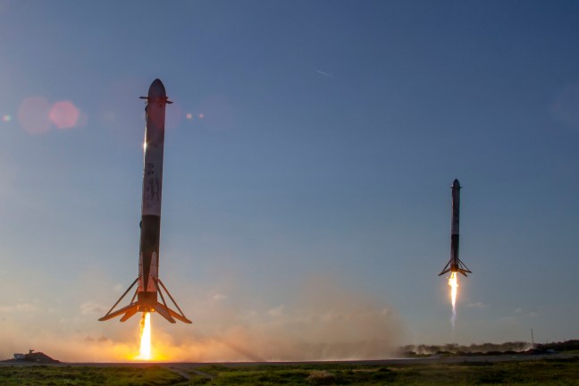 Las etapas laterales del Falcon Heavy aterrizando al unísono